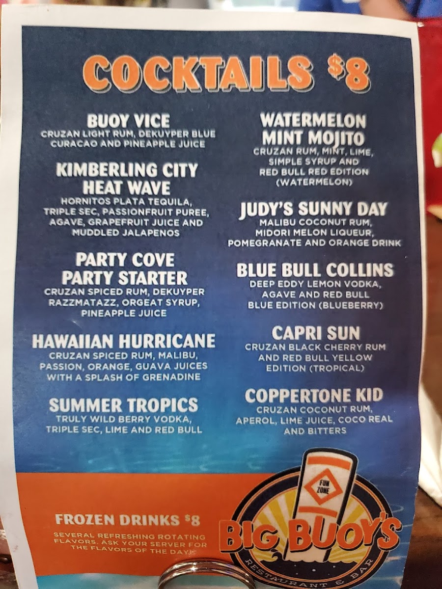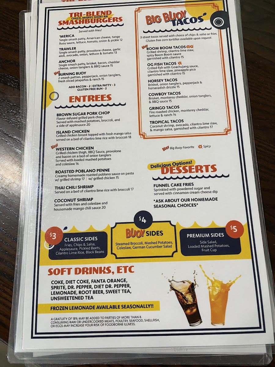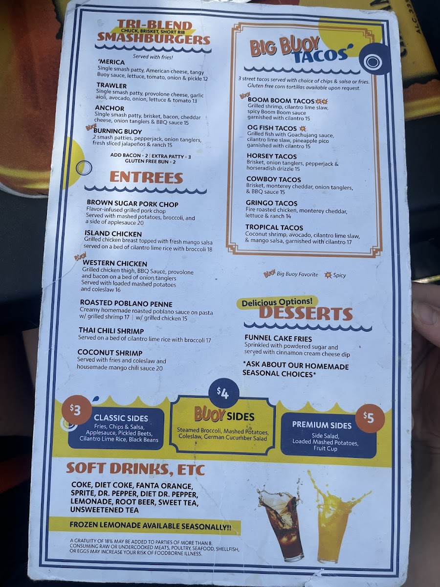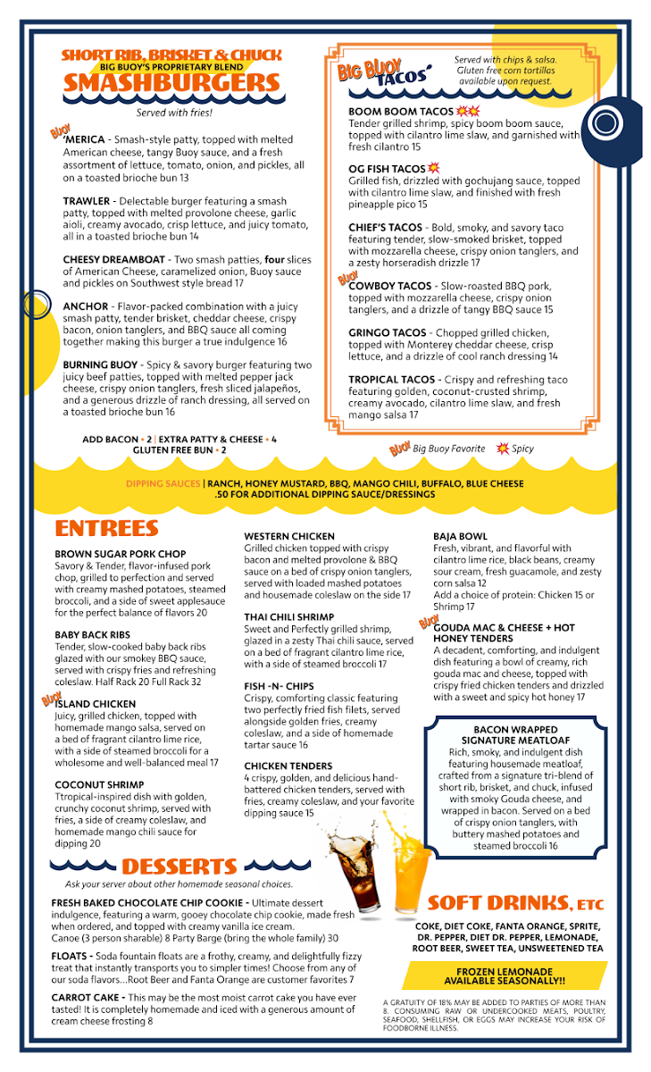 Start your culinary journey with tantalizing appetizers like Onion Tanglers and Garlic Cheese Curds. The entrees are a testament to comfort food, showcasing dishes such as the succulent Baby Back Ribs and delectable Coconut Shrimp. For taco lovers, the Big Buoy Tacos deliver a fun twist, including the vibrant Boom Boom Tacos and refreshing Og Fish Tacos.