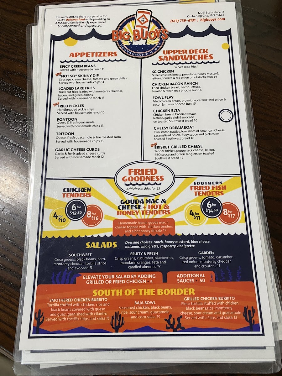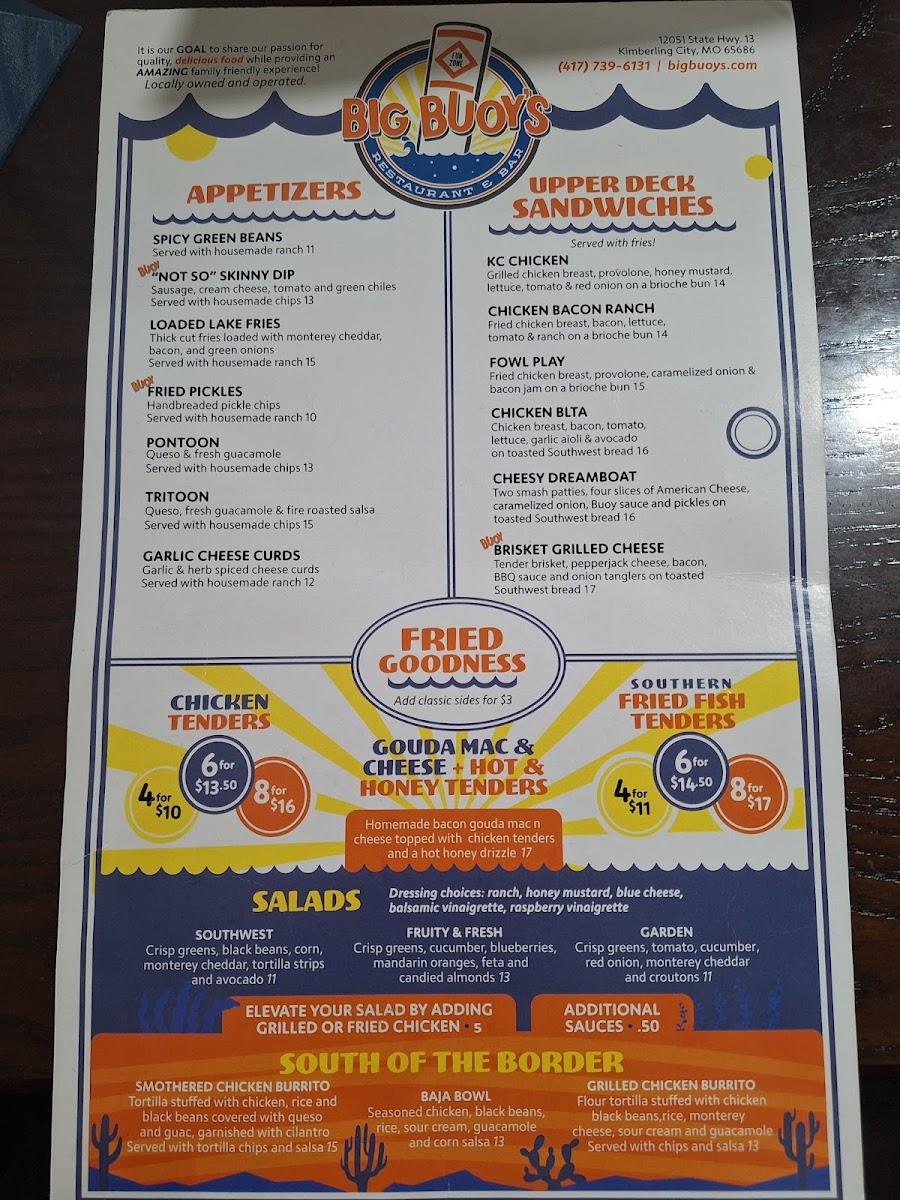 Welcome to Big Buoy's LLC, nestled on the picturesque shores of Table Rock Lake in Kimberling City, MO. This brand offers a delightful menu that features a medley of flavors, perfect for everyone from casual diners to food enthusiasts.